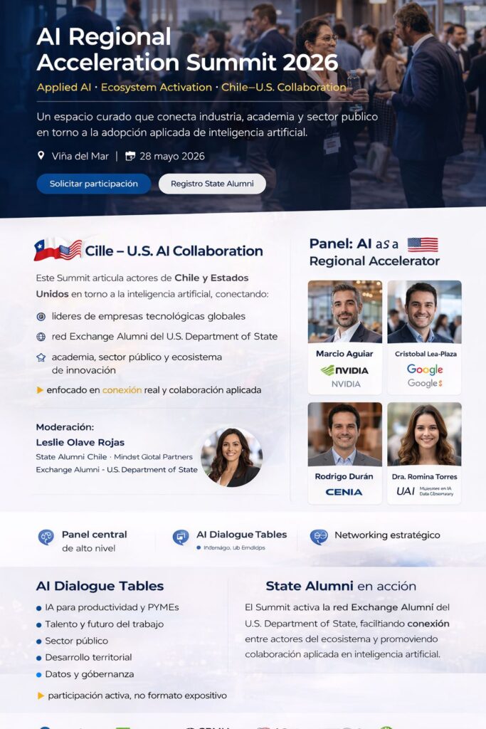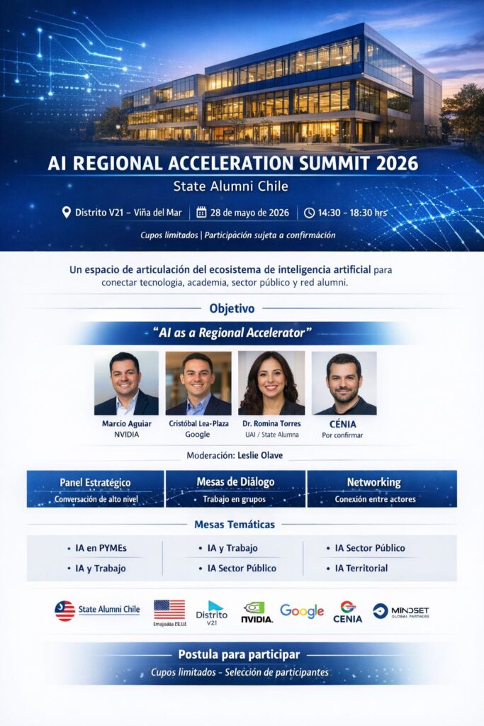 El AI Regional Acceleration Summit 2026 es una iniciativa de State Alumni Chile que reúne a actores que ya están tomando decisiones en torno a la inteligencia artificial en la región.